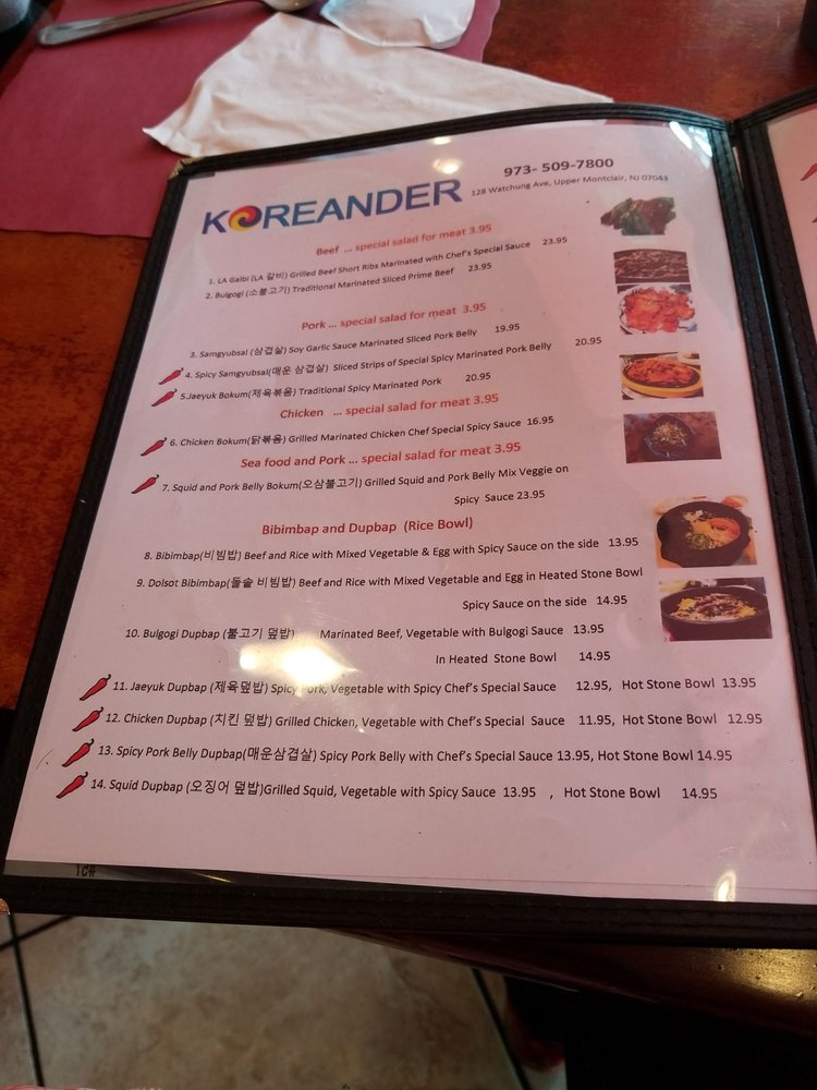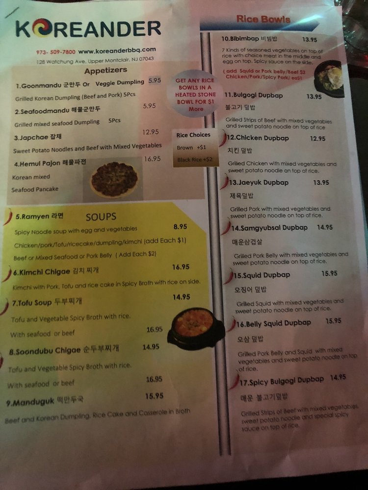 Koreander Restaurant, located in Montclair, NJ, offers a variety of Korean dishes with vegan and vegetarian options. The menu includes appetizers like Goonmandu, Japchae, and Hemul Pajon, soups such as Ramyen and Kimchi Chigae, and rice bowls like Bibimbap and Bulgogi Dupbap. Customers rave about the quality of food and service, with complimentary soup and appetizers provided while waiting. The restaurant is known for its hot stone bowls, with dishes like Bimbimbap and Bulgogi Dupbap being customer favorites. The friendly staff, gender-neutral restrooms, and free Wi-Fi make for a welcoming dining experience. Whether you're craving comfort food like Soondubu Chigae or grilled beef short ribs like La Galbi, Koreander Restaurant is a must-try for Korean cuisine enthusiasts.